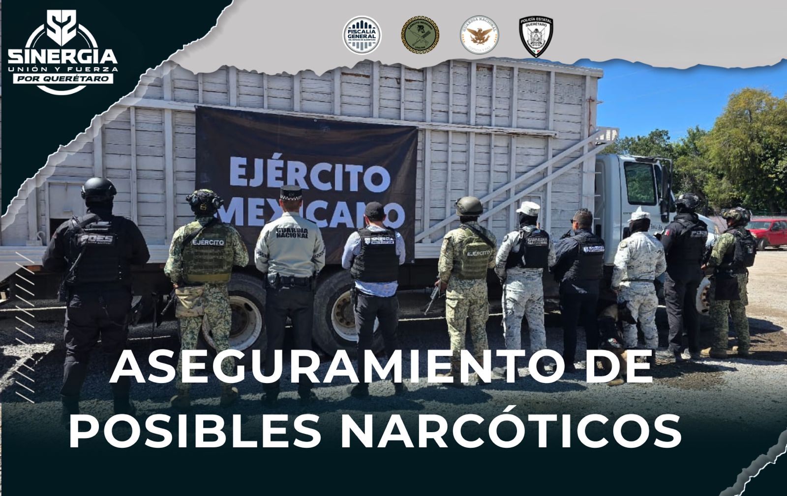 Como parte de los trabajos conjuntos de seguridad e investigación impulsados a través de la estrategia “Sinergia por Querétaro”, la Fiscalía General del Estado de Querétaro, en coordinación con la Guardia Nacional, la Secretaría de la Defensa Nacional (SEDENA) y la Policía Estatal (POES), realizó el aseguramiento de un camión tipo torton en el que fueron localizados 71 paquetes con polvo blanco con características similares a la cocaína.