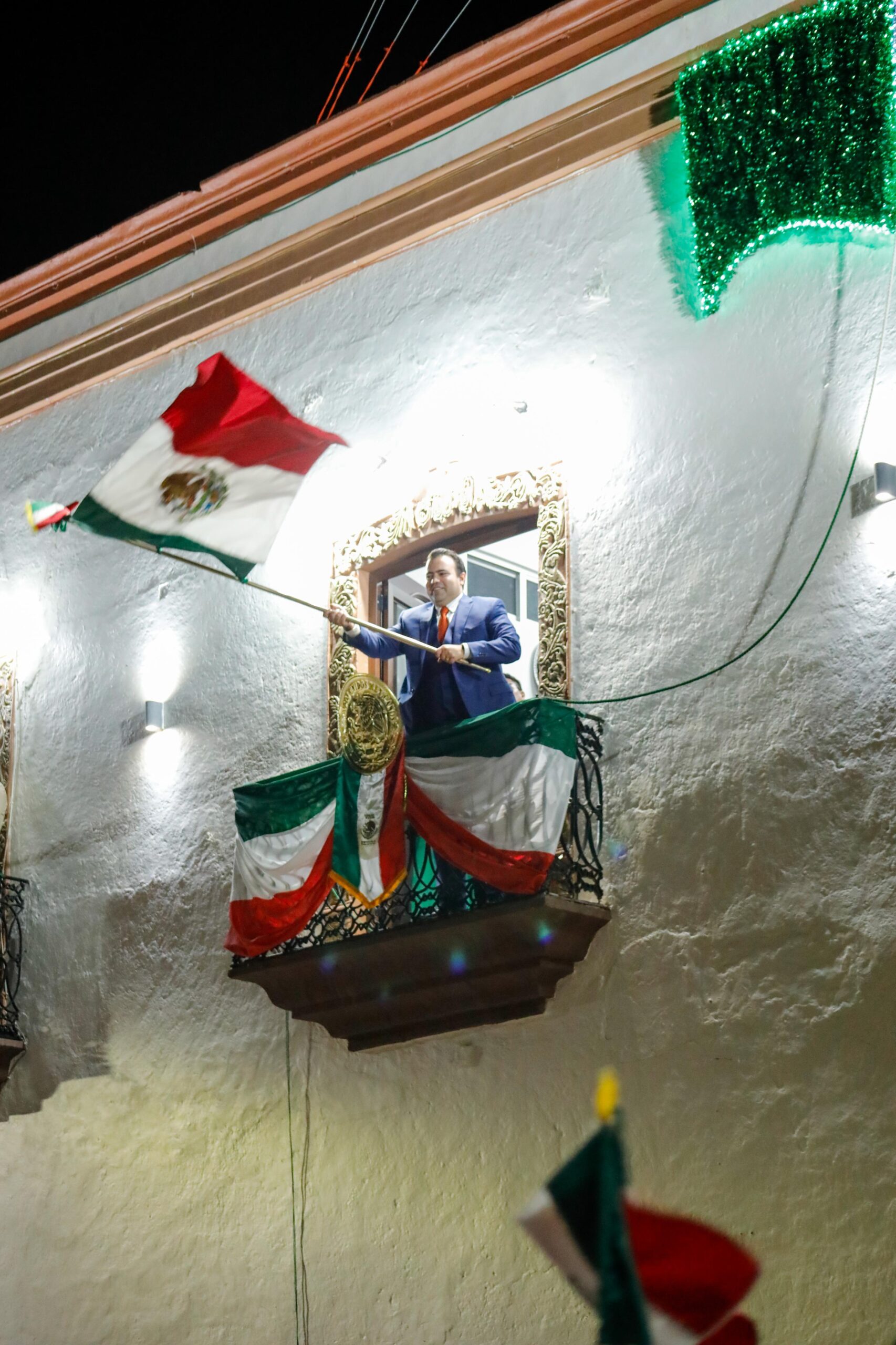 Desde el balcón del Palacio Municipal, acompañado de su esposa, Elena Arreguín de la Torre, familiares, autoridades civiles y militares, vitoreó a los héroes de la patria recordando a Hidalgo, Morelos, Allende, Aldama, Matamoros, Guerrero, Josefa Ortiz de Domínguez, así como a los hermanos Epigmenio y Emeterio González, concluyendo con un vibrante: “¡Viva Colón!, ¡Viva México!”.