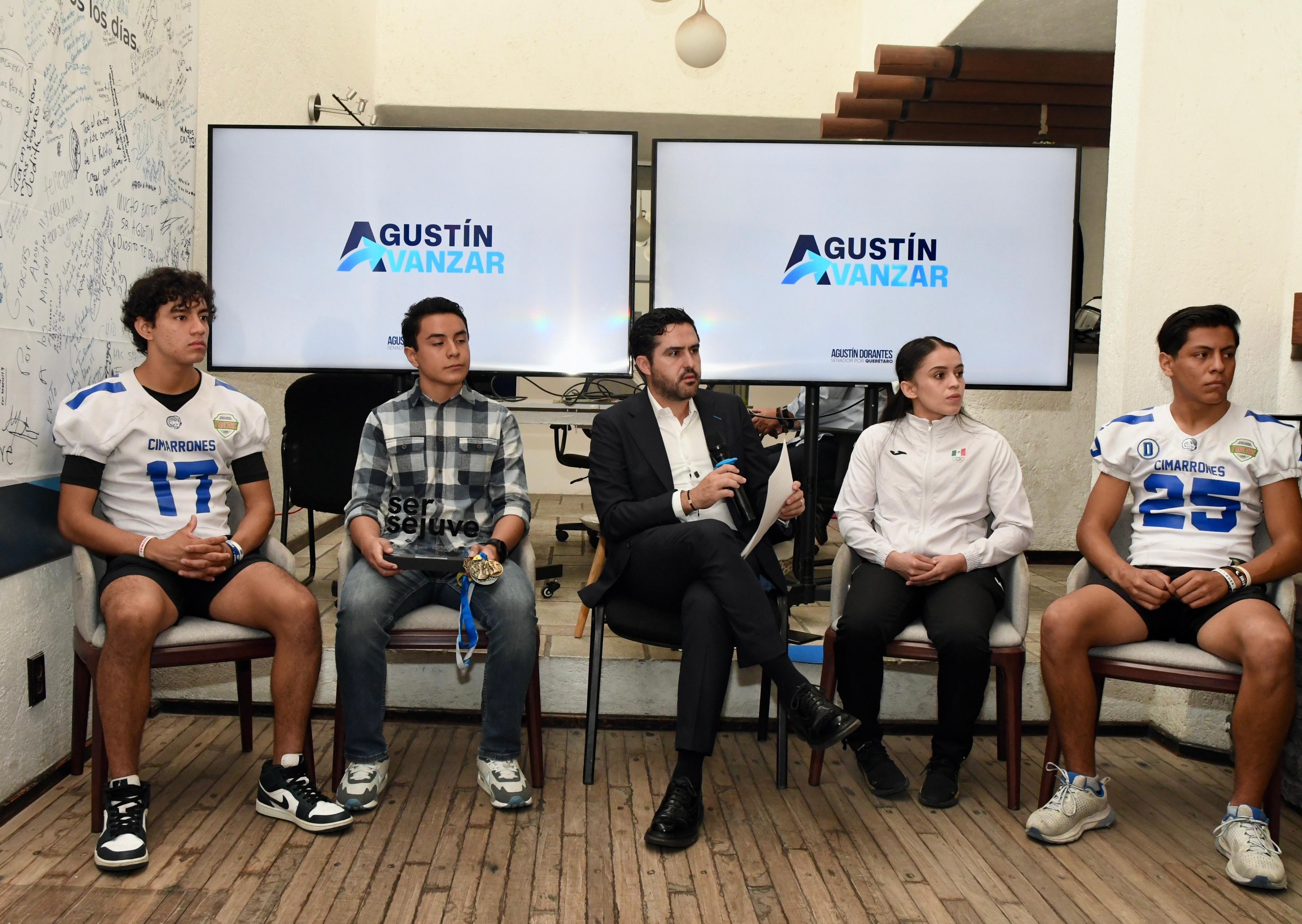 El senador estuvo acompañado de jóvenes atletas queretanos, entre ellos Leonardo Alarcón Montes y Axel Cruz Cano, seleccionados nacionales de futbol americano; Santiago Aldair Ángeles Reyex, Premio Estatal de la Juventud en Labor Social; y Karla Abigail Acosta Martínez, medallista de plata en Lucha Olímpica en los Juegos Centroamericanos 2023, quien actualmente se prepara rumbo al ciclo olímpico de Los Ángeles 2026.