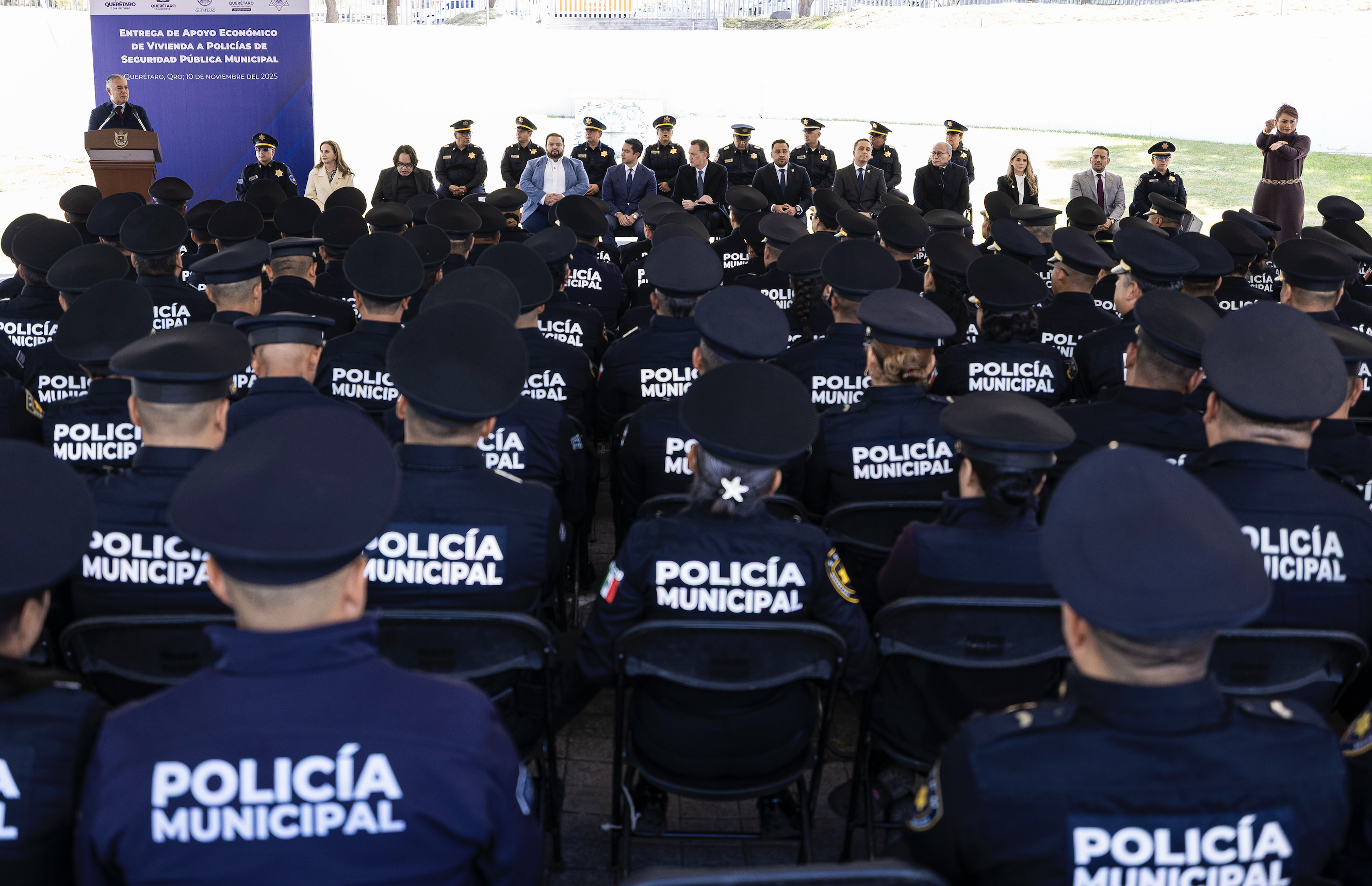 Con el propósito de fortalecer el bienestar y las condiciones de vida del personal operativo de la Secretaría de Seguridad Pública Municipal de Querétaro (SSPMQ), se llevó a cabo la entrega de apoyos económicos en materia de vivienda, en un evento encabezado por el presidente municipal de Querétaro, Felifer Macías, acompañado de autoridades municipales y representantes de la corporación policial.