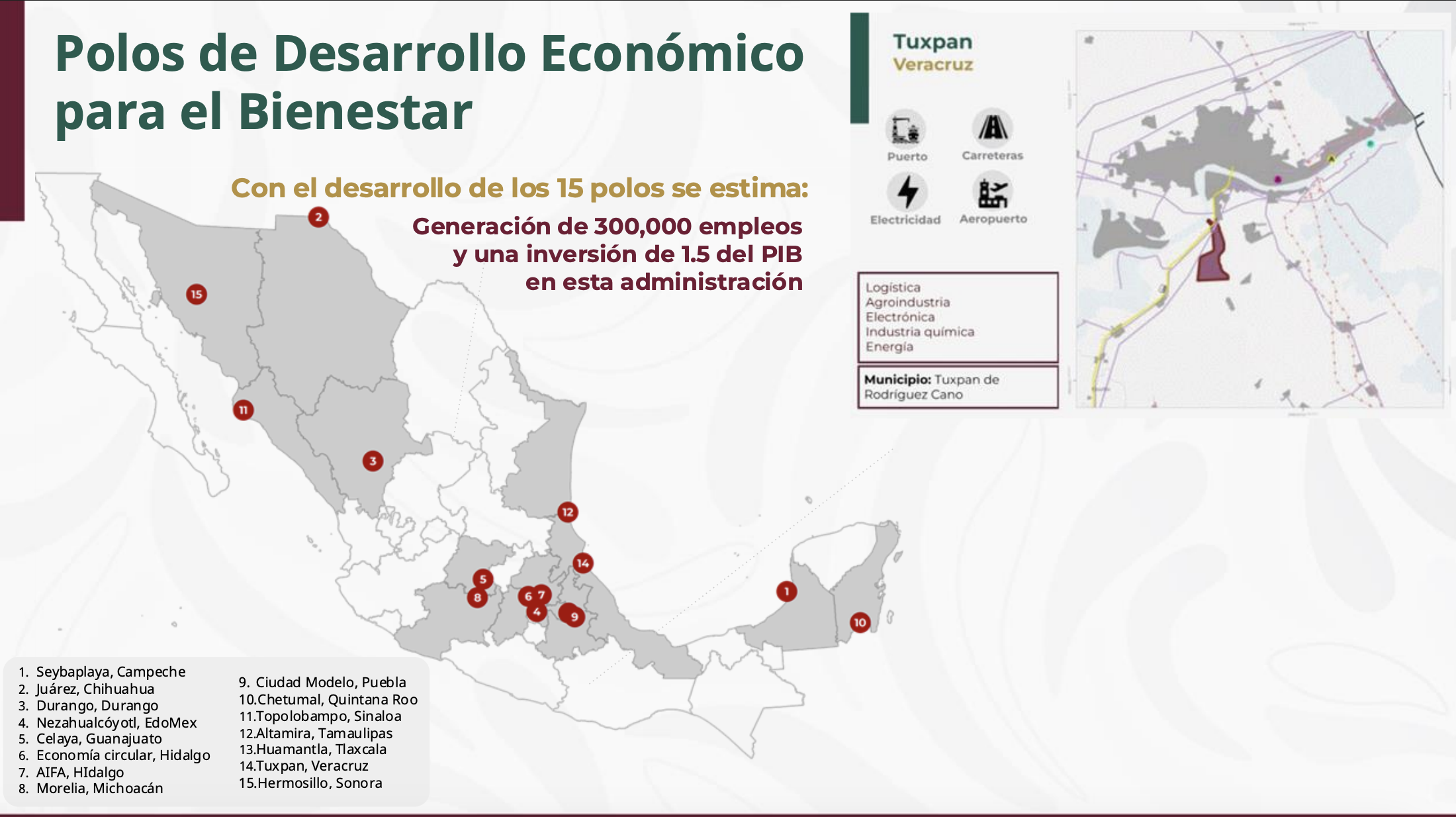 Estos polos estarán ubicados en 14 estados del país, en zonas estratégicas con vocación industrial, de servicios y turismo, para impulsar un desarrollo integral y ordenado, que incluya infraestructura como vivienda, escuelas y hospitales cercanos a los centros de trabajo.