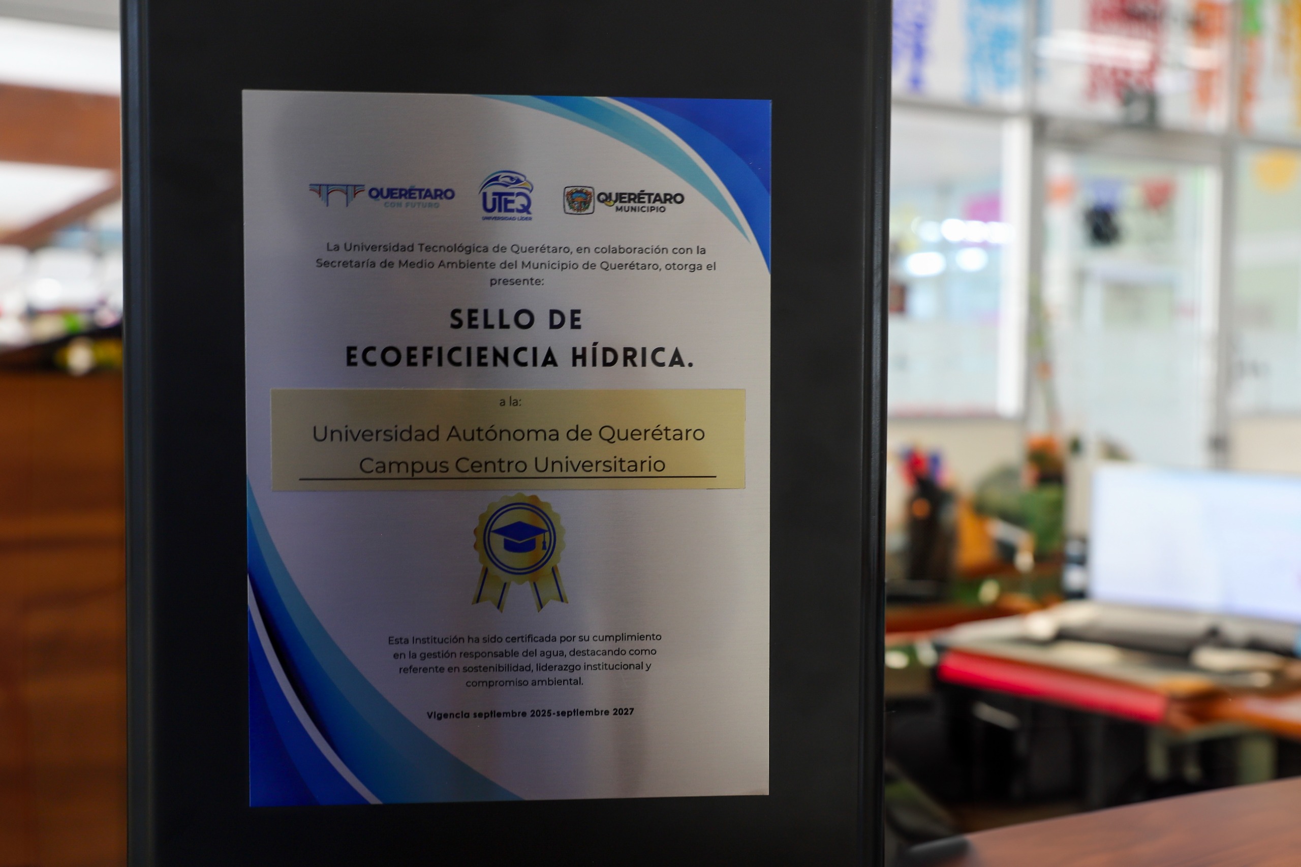 La Universidad Autónoma de Querétaro (UAQ) obtuvo el Sello de Ecoeficiencia Hídrica, reconocimiento otorgado por el Gobierno Municipal de Querétaro, con acompañamiento técnico y académico de la Universidad Tecnológica de Querétaro (UTEQ). Esta distinción acredita a las instituciones que implementan prácticas responsables y de alto desempeño en el uso eficiente del agua, reafirmando el compromiso ambiental de la Máxima Casa de Estudios queretana.