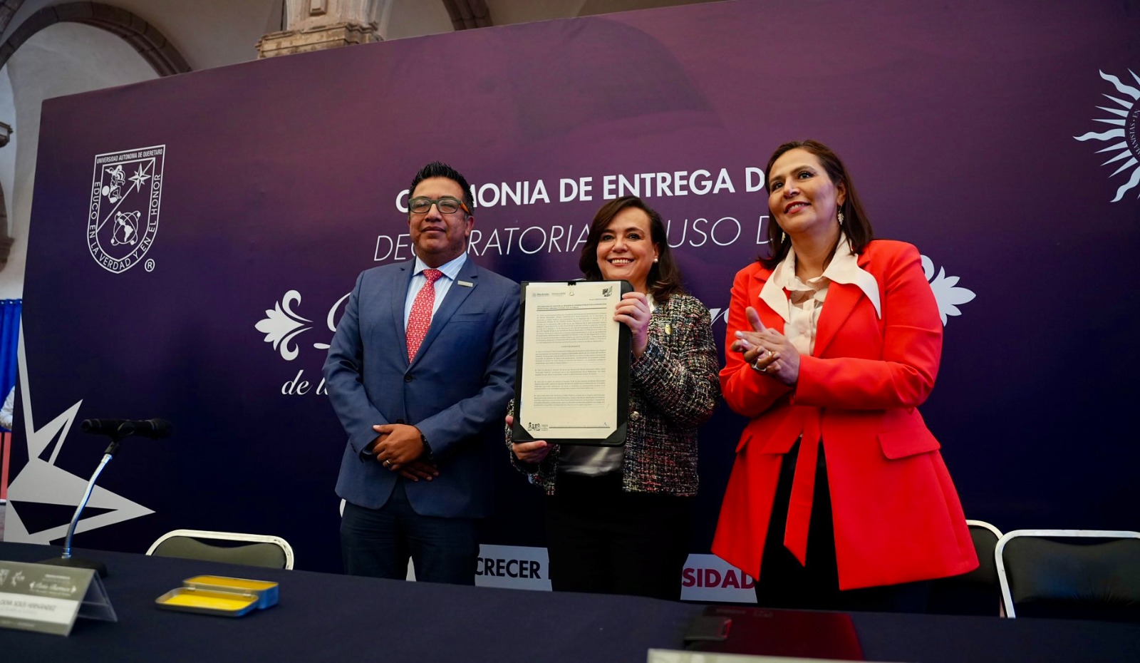 En la ceremonia también estuvieron presentes autoridades estatales como la secretaria de Educación, Martha Elena Soto; la secretaria de Cultura, Ana Paola López Birlain; la secretaria de Turismo, Adriana Vega Vázquez Mellado; y la oficial mayor del Gobierno del Estado, Lynda Rangel, quienes coincidieron en resaltar la relevancia histórica y cultural de este espacio para Querétaro y su comunidad universitaria.