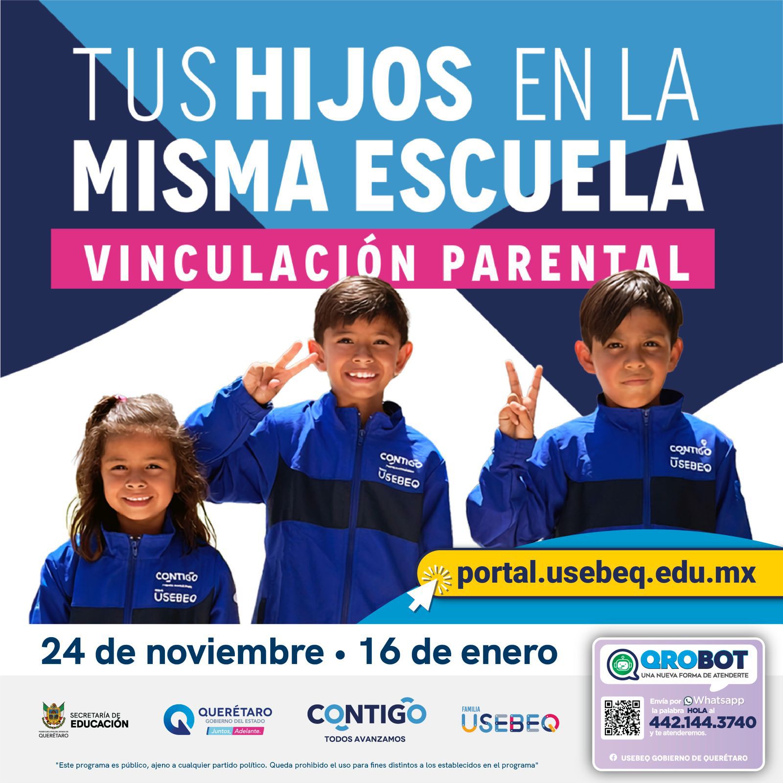 Para resolver dudas o recibir acompañamiento durante este periodo, USEBEQ pone a disposición el Qrobot en el número 442 144 3740, disponible del 24 de noviembre de 2025 al 16 de enero de 2026, en un horario de 9:00 a 14:00 horas.