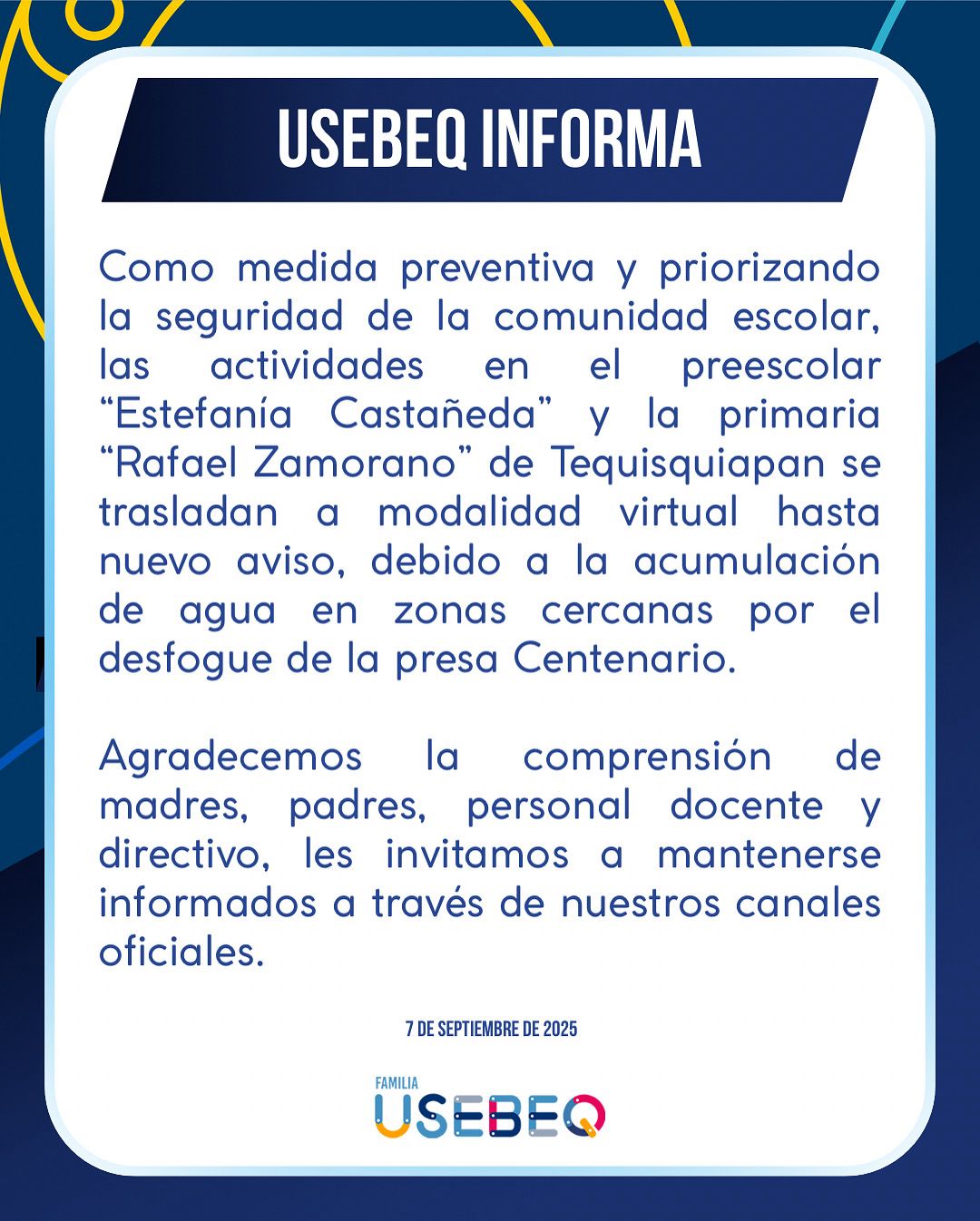 La Unidad de Servicios para la Educación Básica en el Estado de Querétaro (USEBEQ) anunció que, como medida de prevención y priorizando la seguridad de niñas, niños y adolescentes, las actividades educativas en el preescolar Estefanía Castañeda y la primaria Rafael Zamorano del municipio de Tequisquiapan se realizarán en modalidad virtual hasta nuevo aviso.